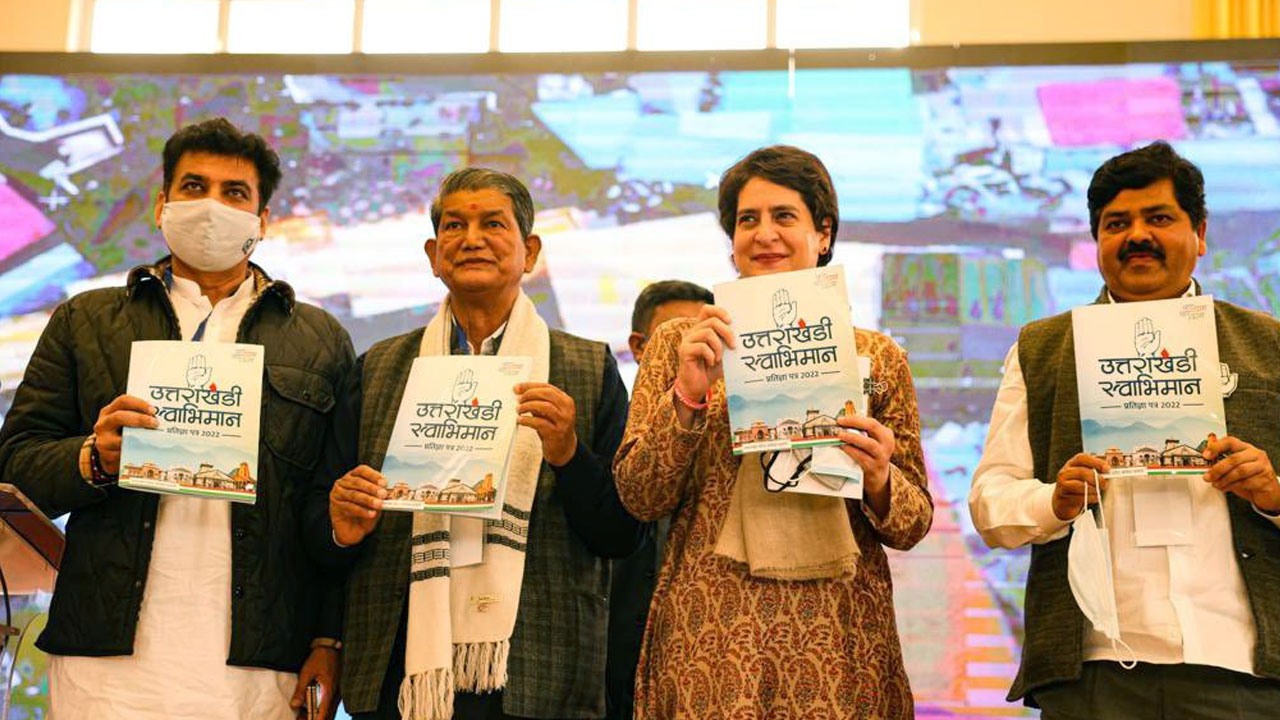देहरादून। Uttarakhand Congress pledge letter उत्तराखंड विधानसभा चुनाव के लिए बुधवार को कांग्रेस ने अपना घोषणापत्र जारी किया। कांग्रेस की राष्ट्रीय महासचिव प्रियंका गांधी ने देहरादून पहुंचकर कांग्रेस प्रदेश मुख्यालय में उत्तराखंडी स्वाभिमान प्रतिज्ञा पत्र को जारी किया।